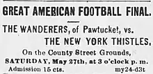 The New York Thistles, the previous year's runner up, entered the final undefeated in the season with 17 wins and two tie games, boasting 123 goals scored and 15 against. The Pawtucket Free Wanderers, along with making their first American Cup final appearance, had won the New England League three weeks prior, finishing in first ahead of the East Ends, Olympics, Rovers, and Clippers of Fall River and the New Bedford Rovers.