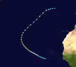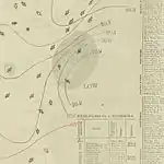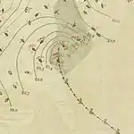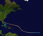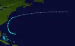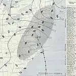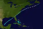 Observations from ships indicated the presence of a tropical storm in the Bay of Campeche on June 12.[1] The storm moved northeastward across the Gulf of Mexico and intensified into a strong tropical storm. Around 23:00 UTC on June 15, the system made landfall southwest of Perry, Florida, with winds of 70 mph (110 km/h). The cyclone weakened somewhat while moving over Florida and coastal portions of Georgia and the Carolinas. After emerging into the Atlantic near the North Carolina–Virginia state line early on June 17, the storm strengthened, reaching hurricane intensity later that day.[2] On June 19, a ship located in the vicinity of the storm recorded a barometric pressure around 999 mbar (29.5 inHg) - the lowest in relation to the cyclone.[1] However, the system then became losing tropical characteristics and transitioned into an extratropical cyclone about 155 mi (250 km) south of Saint Pierre and Miquelon by 00:00 UTC on June 20.[2]
