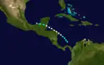 Observations of this storm began as early as July 4 in the southwestern Caribbean Sea,[1] with a ship encountering the cyclone about 130 mi (210 km) north-northeast of Colón, Panama. The system intensified steadily while moving northwestward, becoming a hurricane around 12:00 UTC on the following day. About six hours later, the storm intensified into a Category 2 hurricane and peaked with winds of 100 mph (155 km/h). The hurricane then made landfall near the Nicaragua–Honduras border. The cyclone weakened back to a Category 1 before re-emerging into the Caribbean off the north coast of Honduras early on July 6. Continuing northwestward, the system then re-strengthened slightly, reaching winds of 90 mph (150 km/h) prior to making landfall in northern Belize around 00:00 UTC on July 7. The cyclone weakened rapidly over the Yucatán Peninsula and dissipated just offshore Tabasco several hours later.[2]
