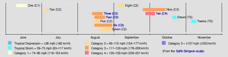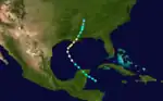 The 8th storm of the season formed in the western Caribbean Sea on September 4. After hitting the Yucatán Peninsula, it strengthened in the Gulf of Mexico to a 95 mph (153 km/h) hurricane. It hit the southern coast of Louisiana on September 7, and dissipated over northeastern Alabama.