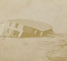 Strong northerly gales affected the Outer Banks of North Carolina for three days, peaking at 72 mph (116 km/h) in Kitty Hawk on October 11.[7] Winds reached 70 mph (110 km/h) along the Virginia Capes and 40 mph (65 km/h) farther west at Norfolk. Just inside the capes, a cargo ship called the Henry A. Litchfield ran aground on October 12. Storm surge flooding inundated the Cape Henry Light keeper's house and washed away telegraph poles, while severe damage was reported in Virginia Beach.[8] There, high waves destroyed fishing nets and crumbled bulkheads, but advance warning of the storm allowed most vessels to safely ride out the storm in port.[9] Near Norfolk, floodwaters damaged the banks of the Dismal Swamp Canal to the point of collapse in some spots.[8] The storm inundated the Virginia Barrier Islands, completely covering Cobb's Island, a popular summer resort, to a depth of at least 1 ft (0.30 m). Pounding waves, reportedly 40 ft (12 m) high, crushed some cottages and partially buried others in sand, while depositing numerous boats in the middle of the island.[10] United States Life-Saving Service crews rescued two women in imminent danger of being swept out to sea. As waters rose, residents fled to the upper stories of their homes to await rescue by lifeguards. The Cobb's Island Hotel was a complete loss,[8] and almost every building on the island sustained some degree of damage. The storm claimed about 50 acres (20 ha) of Cobb's Island, reducing its size by two-thirds; subsequently, the inhabitants abandoned the island, and its use as a resort ended.[10] Due to the slow-moving nature of the hurricane, the flooding persisted for two days before receding.[8]