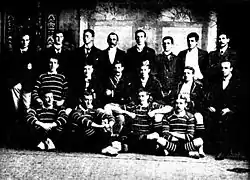 The makeup of the touring squad was described in the earliest communication of 1897 from Mullineux, as a team made of University students from his school Cambridge, as well as Oxford University, and also of international representatives.[2] Two problems faced Mullineux, the first was that the timing of the tour meant that players would need to leave Britain in early May, when the university vacations had not yet begun.[5] The second was that a long tour would preclude many of the best players from participating due to other commitments.[14] Consequently, early lists of probable touring players had few players listed that finally made the tour.[15][16][17] In the pool of potential players the following were noted:[15][16][17][18][19][20] James Byrne, Cecil Boyd, Viv Huzzey, Zimans, Ernest Fookes,[21] Lindsay Watson, M Elliott, Herbert Dudgeon, James Gowans, James Franks, J H Kipling, R Forest, Lawrence Bulger, Timoins,[22] R O Swartz, C B Marston, W Neeks (or Needs), Dr Rowland, J W Gorman, and James Couper. Among these names were several high-profile players that recruitment attempts failed to secure. Byrne declined due to pressure of business, while Ernest Fookes was awaiting a serious medical operation.[23] The final member to join the team was Scottish international Alf Bucher, after failed approaches were made to recruit fellow Scot James Couper and Welsh wing Viv Huzzey.[20]