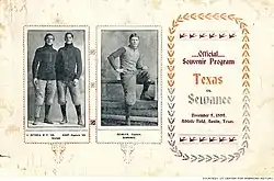 The train carrying the players pulled into Austin on the night of the 8th to face the undefeated Texas Longhorns the following afternoon. Sewanee won 12–0. They scored five minutes into the first quarter, and a minute before the end of the game, "and the intervening time was devoted to the liveliest battle ever witnessed here".[21] Ditty Seibels played throughout the game, scoring both touchdowns, despite his head having split open just above his left eye in the first half and bleeding profusely. He had his wound patched by plaster and he stayed in the game. By the end of the game his head was coated with blood.[21]