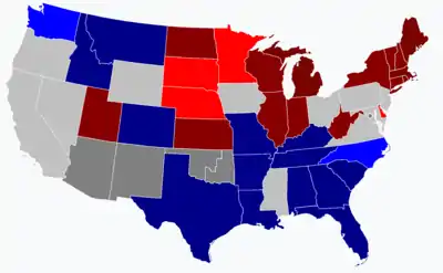 | 1900 presidential election results. Red denotes states won by McKinley, blue denotes states won by Bryan. Numbers indicate the electoral votes won by each candidate. | |