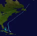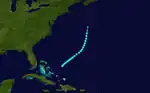 A westward moving disturbance was first noted between Barbados and Grenada on October 19 and later Hispaniola.[5] By early October 21, the system developed into a tropical depression near Turks and Caicos Islands. [2] The depression initially moved north-northwestward across the eastern Bahamas, remaining weak during its passage. After reaching the open Atlantic, the cyclone intensified into a tropical storm by 12:00 UTC on October 23. Strengthening continued, and by early on October 24, the storm peaked with maximum sustained winds of 60 mph (95 km/h) and a minimum barometric pressure of 1,008 mbar (29.8 inHg),[2] both of which were observed by ships.[5] However, the system transitioned into an extratropical cyclone by 18:00 UTC while situated about 190 mi (310 km) southeast of Cape Lookout in North Carolina.[2] The remnants accelerated ahead of a cold front and later struck Newfoundland,[2][5] before dissipating over the Labrador Sea on October 27.[2]