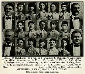 The 1903 Memphis Egyptians season represented the Memphis Egyptians baseball team in the Southern Association and won their first league pennant.[1] The team played its games at Russwood Park.[2] The team was managed by Charlie Frank. The Egyptians were led by pitcher Harry McIntire.[3] Perry Werden led the league in home runs with 8.[4] The team also included pitcher Ted Breitenstein. Both Frank and Breitenstein left for New Orleans next season.[5][6]