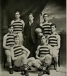 1904-1905 team featured from left to right are (front row) Clarence Houseknecht and George Redlein; (middle row) George Kirchgrasser and Max Rheil; (back row) Edmund Dollard, manager Earl Rice, and captain Art Powell.[1]