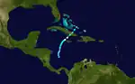 The first storm of the season was observed by ships over the southwestern Caribbean on June 10,[3] about 65 miles (105 km) east-southeast of Isla de Providencia. Moving north to north-northeast, the depression strengthened slowly, reaching tropical storm intensity by early on June 12. After curving to the northeast, the storm strengthened further. It became a Category 1 hurricane on the modern day Saffir–Simpson hurricane wind scale on June 13, several hours before peaking with winds of 80 mph (130 km/h) and a minimum barometric pressure of 1,003 mbar (29.6 inHg),[1][4] both estimated by Ramón Pérez of the Cuban Institute of Meteorology in 2000.[1] Shortly thereafter, the hurricane made landfall near Pilón in Granma Province, Cuba. Early on June 14, the cyclone weakened to a tropical storm. It soon emerged into the Atlantic Ocean, but continued weakening, falling to tropical depression intensity and dissipating over the southeastern Bahamas late on June 14.[4]