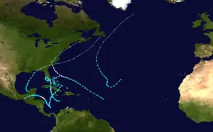 | Four | October 12–21 | Category 1 hurricane | 80 (130) | 989 | Jamaica, Cuba, Florida, Bahamas | Unknown | 7 | [3] | ||