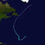 Data from ships on October 19 indicated the presence of a tropical storm about 1,195 mi (1,925 km) northeast of Barbuda.[4][3] After initially moving southwestward, the storm briefly curved west-northwestward on October 20, shortly before turning northward. Around 12:00 UTC on October 21, the cyclone obtained its peak intensity with maximum sustained winds of 50 mph (80 km/h) and a minimum barometric pressure of 1,005 mbar (29.7 inHg), the latter of which was observed by a ship.[4][3] The system then curved northwestward and began accelerating. By 00:00 UTC, the storm transitioned into an extratropical cyclone while located about 365 mi (585 km) south-southeast of Sable Island. The extratropical remnants continued rapidly north-northeastward until dissipating south of Greenland on October 23.[4]