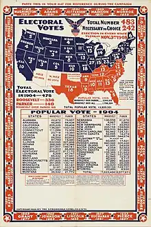 ![]() Presidential election results map. Red denotes those won by Roosevelt/Fairbanks, blue denotes states won by Parker/Davis. Numbers indicate the number of electoral votes allotted to each state. | |||||||||||||||||||||||||||||