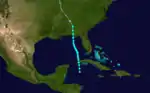 The final storm of the season started as a tropical depression on November 5, located in the Caribbean, south of Cuba. It strengthened into a tropical storm later during the day as it curved northward, and the storm turned towards the northeast on November 6. As it approached Cuba, the storm briefly attained hurricane status; however, as the hurricane made landfall over Cuba, it weakened to a tropical storm. The storm drifted over the Bahamas as a minimal tropical storm on November 8 while it traced east-northeast. It continued to weaken, and transitioned into an extratropical storm on November 10.[2] No damage is known to have been caused by the hurricane. Its path, its intensity, and the time of the year in which it formed are very similar to those of Hurricane Katrina of 1981.