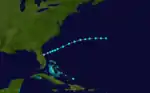 The hurricane slowly intensified as it traveled offshore, continuing to strengthen throughout the day on June 17, eventually reaching Category 2 status by June 18. As the storm headed northeastward, the hurricane began to weaken, becoming a tropical storm by June 21. The system turned toward the east-southeast on June 21, later recurving towards the east-northeast on June 22. It weakened to a tropical depression by June 23, transitioning into an extratropical cyclone later that day.[2] Impacts caused by the hurricane were minimal—a boat was partially dismantled at Key West, and a wharf at Coconut Grove was also damaged. In addition, the schooner Hidie Feroe sank, although her crew was later rescued.[5]