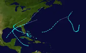 The storm traveled east-northeastward paralleling the Gulf Coast of the United States, and eventually made landfall on the Florida panhandle early on June 29. It weakened slightly as it traversed inland, and entered the Atlantic Ocean just offshore Georgia during the morning. At this point, the storm attained its peak intensity of 65 mph (100 km/h), though it transitioned into an extratropical cyclone within the six hours that followed.[1] Late during the day, the extratropical storm reached New Jersey, and entered Maine on June 30.[6] The 2003 reanalysis made only minor adjustments to the storm's intensity and track created by Partagás and Diaz, which included moving the point of landfall westward and increasing windspeeds on June 29 based on readings received in Jacksonville, Florida.[7]