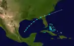 The first identified tropical storm of the season is listed in the Atlantic hurricane database as having formed on June 24, positioned in the western Caribbean;[1] the estimate for this location was based on ship reports, although the information was insufficient to guarantee an accurate position.[6] It initially meandered west-northwestward, though began to turn northwest during the latter half of following day. Late on June 26, it passed between the Yucatán Peninsula and Cuba, and subsequently entered the Gulf of Mexico shortly thereafter. The tropical storm continued to slowly intensify, and started to make sharp curve towards the northeast on June 28.[1]