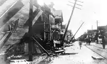 In Key West, sustained winds reached 84 mph (135 km/h). The streets became a "mass of wreckage", with about half of the city described as virtually destroyed.[8] Along Duval Street, telephone and light poles were downed due to high winds. Throughout the city, many frame buildings suffered some degree of damage.[9] At least 500 homes were destroyed, as were seven churches and nine cigar factories, which were among the largest in the Southern United States. The storm demolished two engine houses at the fire department, causing the deaths of several horses and nearly killing firemen in the collapse.[8] Additionally, the post office was damaged and the First National Bank was deroofed. In the vicinity of the island, hundreds of ships were wrecked.[9] Overall, damage in Key West reached approximately $2 million.[9][10] Newspapers initially noted a death toll around 800, with some reporting as many as 3,000 fatalities. However, this was later found to be greatly exaggerated.[11] Two deaths occurred, both from fatal injuries during the storm.[10] After the storm, Key West mayor Joseph N. Fogarty declared martial law, while guards were ordered to patrol the streets. The United States government was asked to send armed forces for additional policing.[12]