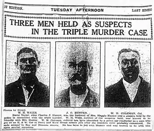 However, a delirious Maggie Hunter, dying in the hospital, would reveal to a Baptist minister, Reverend John S. Wilder, who was sitting at her bedside, the name of the killer. Maggie claimed that her husband, J.C. Hunter, was the one who struck her down.[5] Police were notified, and Hunter was taken into custody after a search of his house revealed a bloody rag and bloody clothes.
