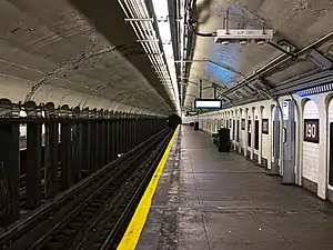 The station has two tracks and two side platforms.[34] It is the third-to-last station on the IND Eighth Avenue Line proceeding northbound.[35] The station's platforms are 660 feet (200 m) long, a typical length of station platforms built by the Independent Subway System, and the station itself is 50 feet (15 m) wide. The platform level contains a double-barrel-vaulted ceiling supported by an arcade in the center. The ceiling is relatively low, in contrast to other nearby deep-level stations such as 181st Street or 168th Street stations on the IRT Broadway–Seventh Avenue Line, where the vaults are larger.[5]: 5
