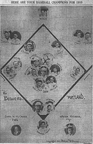 The team was owned by Judge William Wallace McCredie, who later represented the State of Washington in the U.S. House of Representatives. McCredie also served as the club's president while his son, Hugh, was the business manager and his wife, Alice, managed the ticket office. His nephew Walt McCredie played in the National League, batting .324 in 1903, but joined the Portland club as player-manager in 1904 after his uncle became the owner.[3] Walt McCredie was both the manager and appeared in 61 games, mostly in right field.[4] Shortstop Pearl Casey was the team captain.[5]