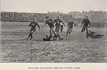 "I just had opportunities and few players overlook them on the gridiron." This statement was made by Hube Wagner. Pitt's star left end, who yesterday played the greatest individual game that has ever been seen on Forbes Field, although he and his teammates were defeated by their time honored rivals-Penn State, 3–0. Wagner may have taken advantage of the opportunities that came his way yesterday, but it is the consensus of opinion that most of these were made by the star end and then taken hold of...Defensively, in one period of the game he made seven consecutive tackles...During the last few seconds of the third quarter, Wagner electrified the crowd when he intercepted a State forward pass on his own 35-yard line and after eluding several opposing tacklers ran to State's 36-yard mark before being brought down by Very."[50]