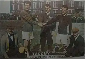 American Cup final in Philadelphia on April 19, 1913. Pictured from left to right: Linesman Addison, True Blues captain Wilson, Referee Burnside, Tacony captain Robert Morrison, and Linesman Bishop.