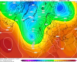 A rapidly deepening low-pressure extratropical cyclone tracked quickly south on the afternoon of 27 October. The central pressure of the system was 990 millibars (29 inHg) at midnight on the 27th,[6] deepening to 975 millibars (28.8 inHg) by 18:00.[7] The low pressure helped to sustain a stream of strong southerly winds, as in days previous,[8] sustaining significantly warmer than average conditions. Temperatures were widely reported over 21 °C (70 °F) in some places.[9] Active weather fronts arriving from the Atlantic Ocean resulted in the instability needed to cause such tornadoes. The low pressure brought cooler air to the country by the 31st.[10]