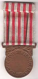 The 1914–1918 Commemorative war medal (French: "Médaille commémorative de la guerre 1914–1918") was awarded to soldiers and sailors for service in World War I. It was also awarded to civilians who met certain requirements. Created by Act of June 23, 1920, it was awarded to any military member for service between 2 August 1914 and November 11, 1918. It is also given to civilians who served in the same period in the army or the Interior.[1]