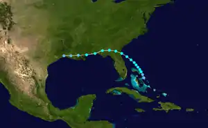 The system drifted northwest while gradually intensifying, and was situated south of the Georgia coast late on September 16. While most tropical systems in the vicinity tend to continue northward along the Eastern Seaboard, the cyclone curved westward and moved ashore near the Florida–Georgia state border after achieving a peak intensity with maximum sustained winds of 70 mph (110 km/h).[2][6] It progressed inland over southern Georgia as it quickly weakened, but its intensity leveled off after around 18:00 UTC on September 17. The storm skirted the northern Gulf of Mexico as it swerved slightly south of due west, weakening to a tropical depression over southeastern Louisiana.[2] By early September 19, the depression had further deteriorated into an open trough—a poorly defined, elongated area of low pressure.[1]