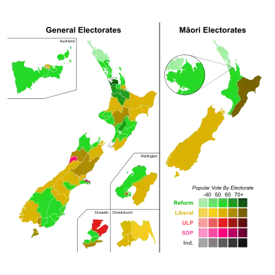 - Auckland West, Hawke's Bay, Taumarunui, Wairarapa, Waitaki and Wellington Central were won by the Liberals from Reform