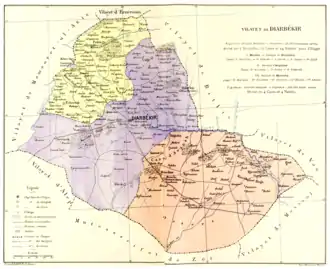 The province was ethnically and religiously diverse.[2][3] Ottoman Muslims dominated urban areas.[3] Because of the millet system, the Ottoman Empire did not recognize ethnic groups, instead different religious denominations, organized as millets.[4] The majority of Diyarbekir Armenians were farmers and inhabited 249 towns and villages concentrated in the north of the vilayet; they belonged to the Armenian Apostolic Church, Armenian Catholic Church, or were Protestant.[2][5][6] The Armenian Patriarchate of Constantinople counted 106,867 adherents in Diyarbekir in its 1913/1914 census, although there were only 73,226 Armenians according to the 1914 Ottoman census.[7] The Syriac Christians in Diyarbekir consisted of Syriac Orthodox Church, Syriac Catholic Church, Chaldean Catholic Church, Church of the East, and Protestants.[5] Until the nineteenth century, these groups belonged to the Armenian millet.[8][9]