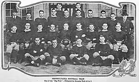 The 1917 Penn Quakers football team represented the University of Pennsylvania in the 1917 college football season. The Quakers finished with a 9–2 record in their second year under head coach Bob Folwell. Significant games included victories over Michigan (16–0), Carlisle (26–0), and Cornell (37–0), and losses to undefeated national champion Georgia Tech (41–0) and Pittsburgh (14–6). The 1917 Penn team outscored its opponents by a combined total of 245 to 71.[1][2]