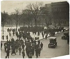 On the morning of Wednesday, December 5, about 15,000 unionists met at the Saint Paul Auditorium and heard speeches from notable labor activists, including Mayor Van Lear.[37] The unionists pledged their support to the streetcar union members and demanded the firing of both McGee and Charles W. Ames from the MCPS.[37] Additionally, they voted to wait until December 11 for federal intervention, vowing to gather again and vote on a general strike if intervention had not occurred by that time.[37] In a bid to show he was not antilabor, Governor Burnquist fired Ames, though kept McGee on the commission.[37] Several days later, on December 7, APL members learned through espionage that some machinist union members were planning a possible statewide general strike.[41] A general strike in the Twin Cities was officially declared to begin at 10:00 a.m. on December 13.[42][43] The union stated that they expected 30,000 people to go on strike, prompting fears that martial law would be declared.[42][44] Governor Burnquist ordered that all liquor stores be closed and instructed the sheriffs of both Hennepin and Ramsey counties to maintain order.[42] By noon, over 10,000 people had walked out of their jobs.[42][43] By that time, Secretary Baker, acting under the authority of United States President Woodrow Wilson, telegraphed William Bauchop Wilson of the President's Mediation Commission to investigate the developments in the Twin Cities, citing a "federal interest" in the matter.[42] Having achieved their goal of federal intervention, at 1:30 p.m., E. G. Hall, the president of the Minnesota chapter of the AFL, called off the strike.[42] In total, this general strike had lasted less than four hours,[32] with no reports of violence.[42] Governor Burnquist, while agreeing to meet with federal mediators, voiced stern opposition to the federal government's decision, calling it an overreach of their power.[42]