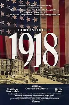 1918 (also known as Horton Foote's 1918) is a 1985 American drama film directed by Ken Harrison and starring William Converse-Roberts, Hallie Foote, and Matthew Broderick.[1][2][3] It is based on the play 1918 by Horton Foote, who also wrote the screenplay for the film. It was followed by On Valentine's Day.