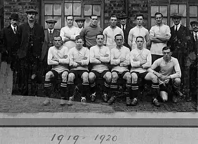 Easily the club's top scorer was Bobby Blood with 26 goals, 24 of which were in the league (Second Division).[1] Blood was playing in the Football League for the first time at the age of 25. Billy Briscoe scored eight goals in seven Central League games, but failed to transfer this success to the Football League.[1] Peter Pursell played 49 of 51 games, with fellow Scotsman William Aitken also rarely missing game.[1] Tom Lyons and Alfred Bourne missed just four Second Division games between them. Tom Holford was another crucial player, who also acted as manager for much of the season. In March 1920, Joe Schofield was appointed manager-secretary.[1]