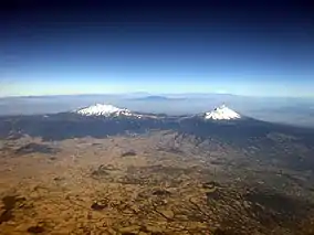 Most slabs undergo metamorphism at 100 km (62 mi) depth, which is ~100 km (62 mi) away from the trench. In Mexico, the slabs attain this depth ~300 km (190 mi) away. Due to the subduction geometry, the volcanic arc gradually migrates away from the trench and forms inland.[8] Intraslab earthquakes within the subducting Cocos Plate beneath central Mexico cease abruptly 100 km (62 mi) south of the TMVB. These earthquakes occur at depths of 60–100 km (37–62 mi). Beneath the TMVB, the Cocos Plate plunge steeply into the mantle. Shallow intraplate earthquakes within the TMVB are located north of where these intraslab earthquakes occur. Crustal deformation in the TMVB is characterized by extension. Deformation occurs along east–west striking normal faults that displace Quaternary volcanic rocks of the belt. Normal faults northwest of Mexico City also display small (10 percent of total slip) left-lateral strike-slip movement.[11][12]