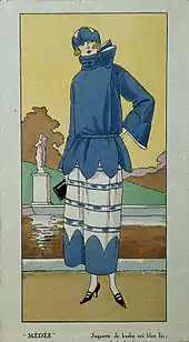 Paris set the fashion trends for Europe and North America.[4] The fashion for women was all about letting loose. Women wore dresses all day, every day. Day dresses had a drop waist, which was a belt around the low waist or hip and a skirt that hung anywhere from the ankle on up to the knee, never above. Daywear had sleeves (long to mid-bicep) and a skirt that was straight, pleated, hank hem, or tiered. Hair was often bobbed, giving a boyish look.[5]