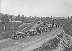 The FIATs proved fastest in practice. The ACF chose to forego the timed-interval start and adopted the rolling start of the American races.[26] The starting order was still by random ballot although by coincidence Felice Nazzaro drew place #1. Race day had rain, making the track muddy.[13] Nazzaro led the 18 cars in the mass-start and was first to reach the Entzheim hairpin, closely followed by the French cars of Friderich (Bugatti), Guyot (Rolland-Pilain) and Goux (Ballot).[13] The FIATs soon showed their superiority and by the eighth lap were running 1-2-3. Other teams fell by the wayside and soon only Bugatti remained to challenge the red cars. Then as the race wound towards its end everything went terribly wrong for FIAT. On lap 51, Biagio Nazzaro's rear axle snapped at speed as he accelerated out of the Entzheim hairpin. The car somersaulted end-over-end, and the driver and his mechanic were both thrown out and killed. Then five laps later, the rear axle broke on Bordino's car. Fortunately, he was at a slower corner and the crew were injured but survived.[13] The veteran Felice Nazzaro, unaware of the disaster, went on to win his last major race, finishing nearly an hour ahead of de Vizcaya's Bugatti. He was told of his nephew's death after he finished. The mechanics examined his car and found the axle cracked in exactly the same place as the other two FIATs.[27][12][26]