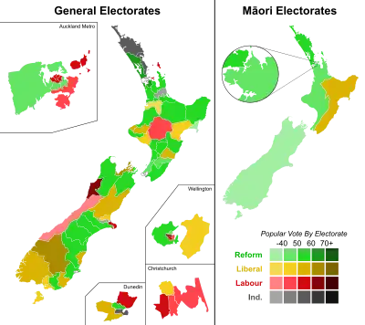 *Note: For numbers of candidates see Wilson (1985) p. 295; for numbers of votes and percentage see Wilson (1985) p. 289. Electorate results given below include 38 Reform and 21 Liberal members. The figures given in the table agree with Mackie and Rose, as well as the article on New Zealand elections.