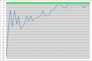 Nelson started the new year with a 1–1 draw at Ashington; Ellerington scored for the second time in three matches but it was cancelled out by a goal from Bill Watson. A week later, half-back Ernie Braidwood netted his first of the season as the team secured another 1–1 draw away at Wrexham's Racecourse Ground. In the first home match of the new year, on 17 January 1925, Nelson atoned for their defeat to Accrington Stanley earlier in the season with a 4–1 win thanks to two goals from Eddleston, one from Chadwick, and a first goal in almost three months for Cameron. Clem Rigg scored two penalties the following week as the side beat Barrow to move above Bradford Park Avenue into fifth position in the Third Division North.[11] On 7 February Nelson won their third consecutive home fixture, beating Tranmere Rovers by four goals to one. Left-half Herbert Butterworth made his senior debut for the club against Tranmere, despite signing from Wolverhampton Wanderers almost two years previously,[12] while Chadwick scored twice in one game for the first time.[7] A trip to Walsall seven days later brought a first away victory of 1925 for the team as goals from Chadwick and Hoad gave Nelson a 2–1 win, which elevated them to third place in the league. A narrow win against Wigan Borough at Seedhill on 21 February lifted Nelson further up the table into second position, behind only Darlington. The team ended a successful February with a fourth victory of the month, beating Halifax Town 4–2 before a crowd of 10,000 spectators at The Shay.[7]