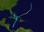 Late on October 13, a minimal tropical storm formed in the western Caribbean Sea east-northeast of northern Honduras.[4] The storm moved slowly west-northwest and gradually turned north on October 15. Later that day, it steadily intensified, attaining hurricane intensity on October 17. It strengthened to the equivalent of a major hurricane on October 19. The storm then struck the Pinar del Río Province of Cuba with sustained winds of 165 mph (266 km/h). On October 20, the hurricane turned east-northeast in response to the southward movement of a ridge.[3] It quickly weakened and made landfall in Southwest Florida near Naples, Florida as a Category 1 hurricane.[19] The storm entered the Atlantic Ocean north of Miami with 70 mph (110 km/h) winds. The cyclone steadily weakened as it moved across the western Atlantic Ocean, before dissipating west-southwest of Bermuda on October 23.[4] Following reanalysis released in March 2009, the storm was re-classified as a Category 5 with winds of 165 mph (266 km/h) and a minimum pressure of 910 mbar (27 inHg).[20]