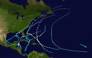 Early on November 5, a tropical storm formed in the southern Caribbean Sea, while located about 275 miles (443 km) north-northwest of Panama City, Panama.[4] The system moved northward with winds of minimal intensity, and it struck Clarendon Parish, Jamaica on November 7 with 40 mph (64 km/h) sustained winds. Early on November 8, it left the northern coast of the island, and it strengthened prior to making landfall west of Santiago de Cuba on November 9.[4] Later, the cyclone strengthened to a hurricane as it entered the Atlantic Ocean, and it turned northeast over the Turks and Caicos Islands on November 10.[3] The hurricane accelerated while heading away from the Turks and Caicos Islands on November 11. Shortly thereafter, it attained a peak intensity of 80 mph (130 km/h) and maintained Category 1 status until November 13. The system passed east of Bermuda and weakened to a tropical storm on November 14. It quickly became extratropical and was last reported on November 15.[3][4]