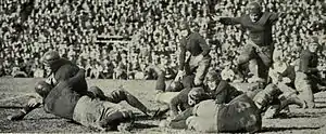 On October 24, Michigan won its fourth consecutive shutout with a 3–0 victory over Illinois at Champaign, Illinois. The victory came as Illinois celebrated homecoming in front of a record crowd of 67,000 at Memorial Stadium.[21] In 1924, Illinois had defeated Michigan, 39–14, as Red Grange scored four touchdowns in the span of ten minutes. Stopping Grange was considered to be the key to beating Illinois in 1925.[22] During the pre-season practice sessions, Michigan's line coach Tad Wieman dressed a player in a sweater with Grange's number (77) and sent his guards and tackles "after the mythical Grange with instructions to 'hit him hard.'"[23] Before the game, Michigan coach Yost told reporters: "One of the greatest throngs in all football history is here. For weeks the game has been on every tongue. . . . Our players have been compared as to weight, speed, and ability. The stage is set."[24]