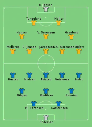 IK Aalborg Chang and Horsens FS (reserves) finished last in their respective groups and hence had to contest in play-off matches for their spots in the 1927–28 JBUs Mesterskabsrække. Kolding BK qualified to the play-offs by winning their JBUs A-række south group final match on 22 May 1927 against Vejen SF with 2–0, while Randers SK Chang secured a victory against Ry BK in their JBUs A-række north group final match.[31] Randers SK Chang's line-up for the match was composed of Pind (goalkeeper) – Heron Sørensen, Evald Larsen (defenders) – Carl Emil Sørensen, Valdemar Hansen, Kaj Christensen (midfielders) – Petrus Milwertz, C. Holting, Keill, H. Broberg and Willy Hansen (forwards).[32] IK Aalborg Chang's line-up consisted of Erik Bratten (goalkeeper) – Ingvald Petersen, captain Tom Nielsen (defenders) – Ejner Thomsen, Oscar Jensen, Aage Larsen (midfielders) – Jens Anker Arentoft, Fritz Jensen, Kaj "Mester" Eriksen, Baldus Buus and K. E. Christiansen (forwards), which was different from the team's main line-up due to sick leaves.[32][33][34] Horsens fS reserves's reinforced line-up featured Jerichau (goalkeeper) – Kaj Kleine, Emborg (defenders) - Hartvig Petersen, Herluf Petersen, Mar. Hansen (midfielders) – Viggo Mellerup, Sigvald Sørensen, Børge Beck, Victor Hansen and Henry Jacobsen (forwards).[35] The team of Kolding BK included P. Wergeltoft (goalkeeper), Emil Hansen, Skøtt, Knudsen, Ravn, Arne Hansen, "Smeden" and Jeppesen in their squad.[36]