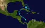 Early on October 3, a tropical depression developed in the South-Central Caribbean about 100 mi (160 km)/h) east of Serrana Bank and the Miskito Cays. It quickly intensified into a minimal tropical storm with maximum sustained winds of 40 mph (64 km/h), the strongest in its life span. Curving west-northwest without further intensification, the weak cyclone made landfall near Barra Patuca in Gracias a Dios Department, Honduras, shortly before 12:00 UTC on October 4. Shortly thereafter, the storm gradually turned just north of due west, and early on October 5, after degenerating into a tropical depression, it made a second landfall over Belize just south of Alabama Wharf in Toledo District. Less than 12 hours later, the cyclone dissipated over eastern Guatemala.[9]