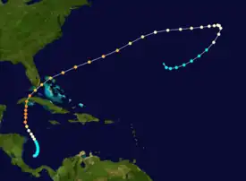 The first storm of the season formed early on July 22 about 200 mi (320 km) east of the island of Barbados and gradually strengthened into a hurricane a day later. At 00:00 UTC on July 24, the hurricane made landfall at Cabo Rojo, Puerto Rico, with winds of 105 mph (169 km/h). Weakening as it crossed Puerto Rico, the cyclone quickly regained strength on July 25 as it moved through the Bahamas; rapidly reaching maximum sustained winds of 130 mph (210 km/h), it attained the equivalence of Category 4 intensity—one of only four Atlantic hurricanes to have done so in or before the month of July. After peaking at 140 mph (230 km/h) with an estimated central pressure of 967 mb (28.56 inHg).[13] With such high pressure, it was the least intense Category 4 Atlantic hurricane on record. Based on ship observations,[10] the cyclone struck the island of New Providence, the seat of the Bahamian capital Nassau, on the morning of July 26, with sustained winds of 135 mph (217 km/h). Weakening thereafter, the storm moved northwestward, paralleling the east coast of Florida, but came ashore near New Smyrna Beach early on July 28 with winds of 105 mph (169 km/h). Thereafter, the cyclone quickly diminished in intensity, becoming a tropical depression on July 29, as it curved west-northwestward over Georgia; three days later, it became an extratropical cyclone and dissipated over Ontario, Canada, on August 2.[9]
