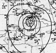 Reports from the government of the Mexican state of Veracruz indicate that in late September 1926 a tropical disturbance formed in the northwest Caribbean Sea, then moved across the Yucatán Peninsula and the Bay of Campeche to strike Veracruz as a hurricane on September 28.[54] The storm reportedly began with sudden fury at 16:00 UTC and produced unspecified winds as high as 124 mph (200 km/h)—if sustained, equal to those of a strong Category 3 hurricane—causing boats to be stranded, roofs to be torn off, and trees and electric cables to be blown down,[55] though the worst conditions reportedly lasted only two hours.[56] The reported storm ruined most of the seashore as a storm tide destroyed the local breakwater, including at the historic Hotel Villa del Mar in the city of Veracruz, demolishing most of the hotel as well as the yacht club there,[13] and forced train service to be suspended. The city was flooded to a depth of 5 feet (1.52 m), but well constructed buildings in the city center survived the wind. Several ships were sunk in the harbor, and several sailors were feared drowned.[56] However, a peer-reviewed publication in 2012, which reanalyzed the 1926 Atlantic hurricane season, did not confirm its supposed existence.[13]