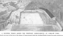 Albert Asher the well known former New Zealand international was appointed to work on the ground staff at Carlaw Park. He would be busy mid season when torrential rain leading up to the round 5 matches forced their abandonment. A large hole opened up on the number one field due to water overflowing from the railway embankment and the surrounding hills overwhelmed the surface drains. "As a result, the water forced its way back, emerging from a joint in the main pipe. The ground for some feet around was raised and, when it subsided, an open hole was revealed". It took several days to repair the playing area which was open again for the following weekend.[2] In December proposed plans for Carlaw Park's redevelopment were released though they were not carried out as shown in the image. The image showed the terraces becoming a large multilevel stand with a terrace type stand where the railway stand was at the time.