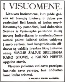 The official rationale given by the military was that their actions had prevented an imminent Bolshevik coup, allegedly scheduled for 20 December. Martial law was declared. About 350 communists were arrested and four leaders (Karolis Požela, Juozas Greifenbergeris, Kazys Giedrys and Rapolas Čarnas) were executed on 27 December.[11] This was a serious blow to the Communist Party of Lithuania and it was inactive for a time.[16] No concrete evidence was ever found that the communists had planned any coups.[11] Other political parties and organizations were not brutalized and, according to the military, no casualties were associated with the coup, apart from the four executions.[12] However, other sources cite the case of Captain Vincas Jonuška, who was allegedly shot by the guards of the Presidential Palace, and died a day later in a hospital.[19]