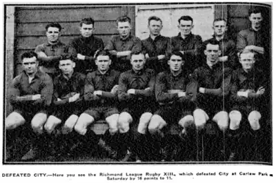 Round 2Prior to round 2 Wigan made an offer to Lou Brown of the City side, while Ben Davidson had reportedly received one from Hull. Future New Zealand coach Bill Telford debuted for Richmond and scored a try in their 15-15 draw with City. In the same match brothers Ken and Ray Hyland clashed heads diving to save a try with the result that Ken had to leave the field and Ray had to bandage his bleeding head to continue.