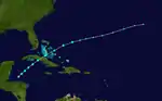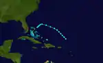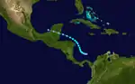 A tropical storm was first noted about 455 miles (730 km) northeast of Barbados around 18:00 UTC on September 8. It intensified on a west-northwest course, becoming a hurricane early on September 10 prior to moving through the U.S. Virgin Islands.[3] The hurricane continued into Puerto Rico – making landfall on the north coast of the island on September 11 – defying initial projections that it would pass safely north.[35] Early on September 12, the storm struck near Punta Cana, Dominican Republic as a minimal hurricane. The cyclone weakened to a tropical storm as it moved south of due west across Haiti, Jamaica, and the western Caribbean. At 19:00 UTC on September 14, it made another landfall north of Belize's border with the Yucatán Peninsula as a strong tropical storm. The cyclone emerged into the Bay of Campeche and quickly strengthened to its peak as a Category 2 hurricane with maximum sustained winds of 100 mph (160 km/h), making a final landfall just east of Veracruz, Veracruz, at 06:00 UTC on September 16 at that intensity. It rapidly weakened once inland and dissipated after 18:00 UTC.[2]